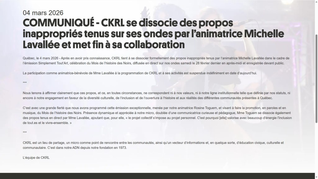 À la suite de cette mobilisation, CKRL s’est dissociée publiquement des propos tenus et la Table du Mois de l’histoire des Noirs a retiré l’animatrice de sa programmation.